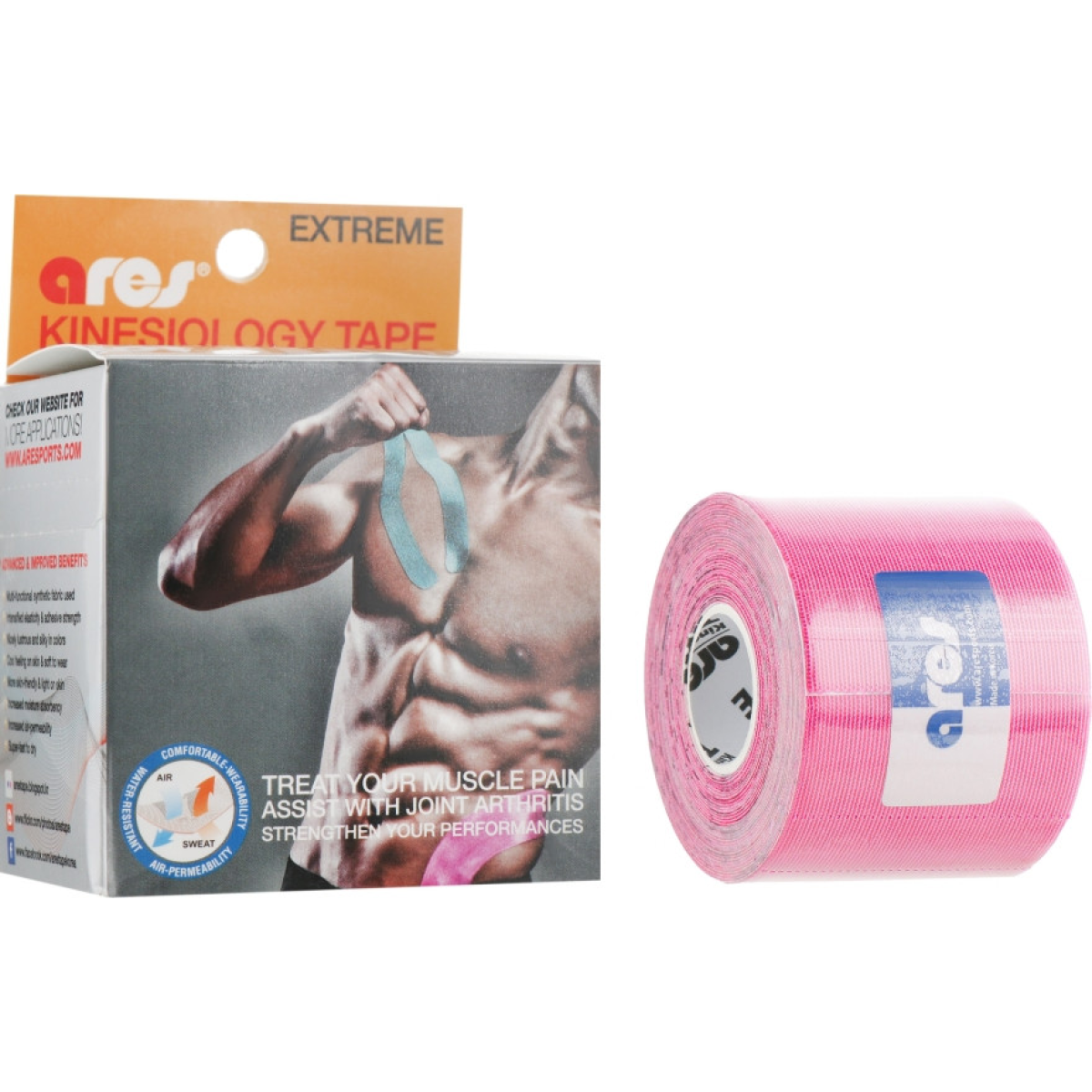 Якщо Вам потрібен витривалий кінезіотейп, який надасть надійну підтримку при активних фізичних навантаженнях, оберіть модель ARES Extreme. Головною його відмінністю від інших тейпів цього виробника є матеріал, з якого виготовлена стрічка — на зміну бавовні прийшла синтетична тканина високої якості.