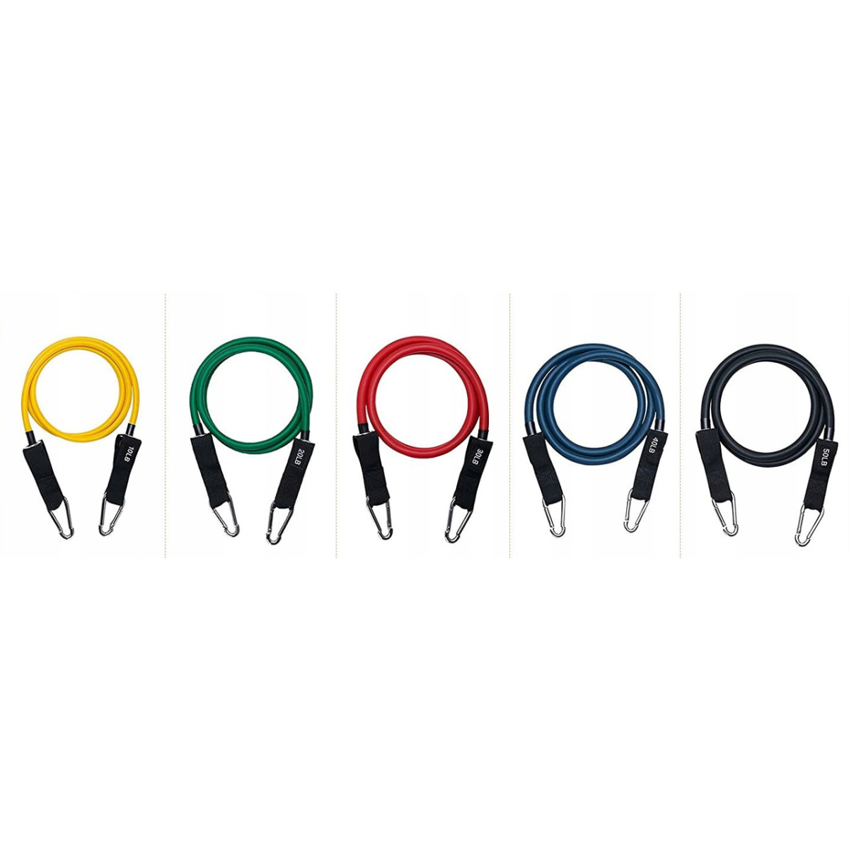 Наші стрічки стійкості доступні в 5 різних рівнях опору . Кожен у різному кольорі та описі його потужності. Ви можете додати до них стрічку, щоб прикріпити гумки, наприклад, до штанги, щоб отримати ще більший опір .