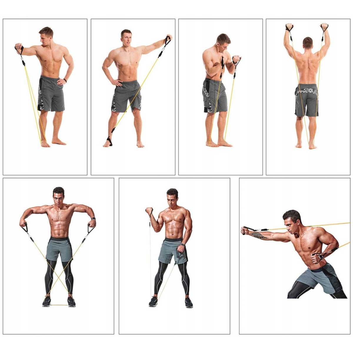 Завдяки нашому тренажеру ви зміцните м'язи рук : біцепси , трицепси , плечі та передпліччя . М'язи грудей і спини придбають кращий об'єм і скульптуру , а ваш стан і витривалість значно покращаться. Ви також можете тренувати м'язи ніг і сідниць , не виходячи з дому. Пропонований нами набір дозволить вам тренувати все тіло абопевні групи м’язів, нарощують м’язи, спалюють жир і покращують гнучкість.