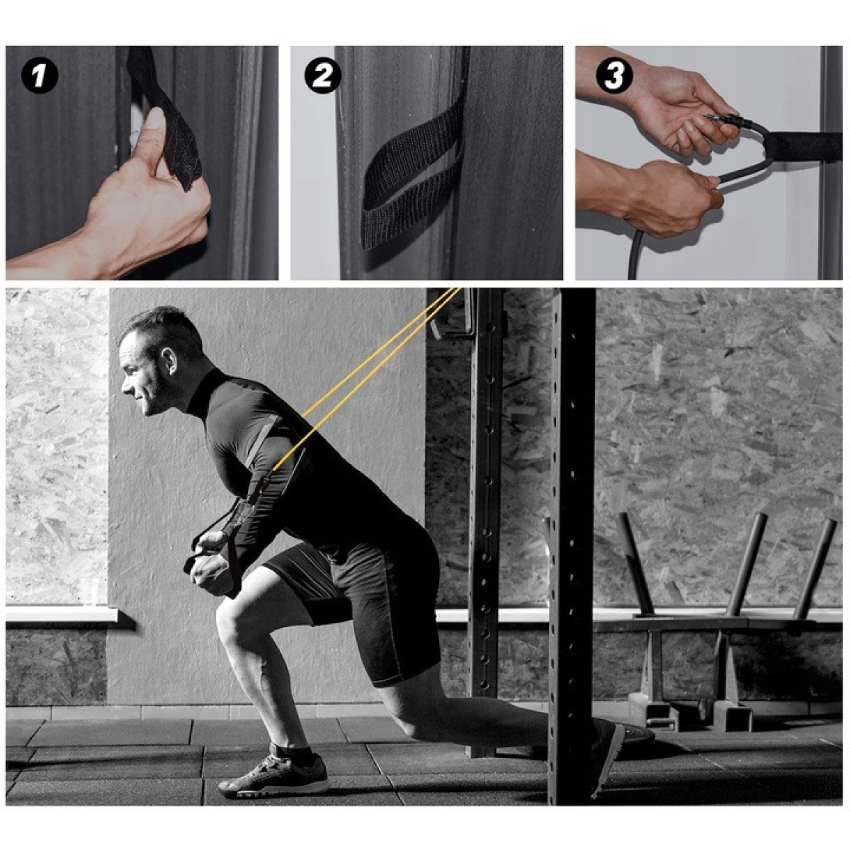 Гумки можна прикріпити до дверей, у шафі тощо, якщо ви хочете розширити своє навчання. Їх довжина до 120 см, що дозволить легко знайти місце для складання.