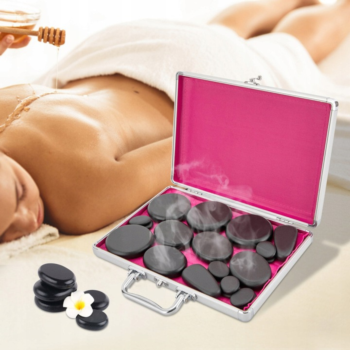 - Висока функціональність: масаж тіла гарячими вулканічними каменями може допомогти зняти стрес, розслабити тіло та ефективно вивести шлаки з організму. Можна використовувати з ефірними маслами (не входять в комплект). Після того, як гаряча вулканічна порода вбере ефірну олію, нанесіть її на шкіру та виконайте найглибший масаж, щоб поглибити дію ефірної олії на шар шкірного сала, сприяючи кровообігу та усуваючи набряклість.