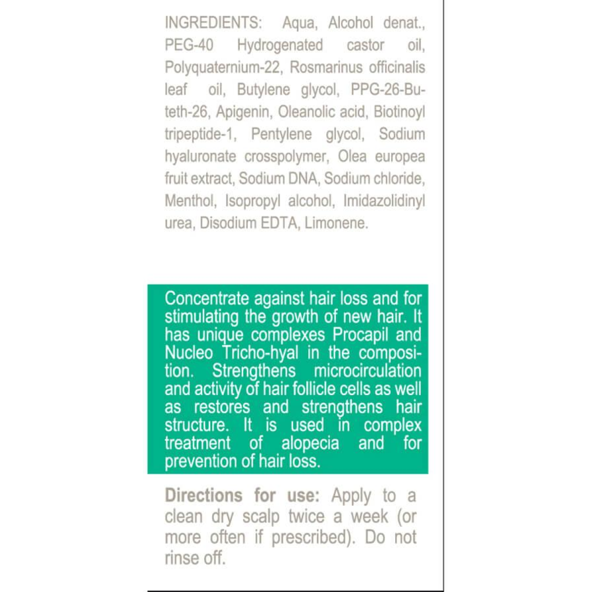 Концентрат проти випадіння волосся посилює обмін речовин і трофіку волосяних фолікулів. Володіє потужною антиоксидантною дією, перешкоджає передчасному переходу волосся в стадію телогена. НЕ викликає синдрому відміни!