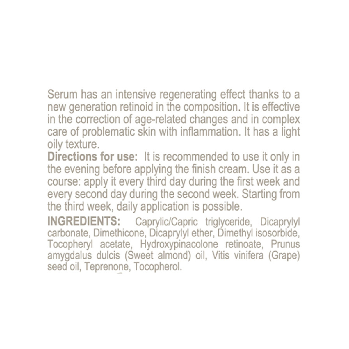 Сироватка містить два унікальні компоненти. Ретиноїд HPR останнього покоління є найефективнішим для оновлення шкіри серед похідних ретинолу і водночас абсолютно безпечним, з дуже низьким потенціалом подразнення. Пептидний комплекс Renovage сприяє потовщенню шкіри, відновленню її тургору завдяки стабілізації теломерів у ДНК клітин. Комплекс олій солодкого мигдалю і виноградних кісточок насичує шкіру антиоксидантами, запобігаючи запальним і окислювальним процесам у тканинах. Сироватка має легку маслянисту текстуру, відмінно поглинається шкірою, не створюючи плівки на її поверхні.