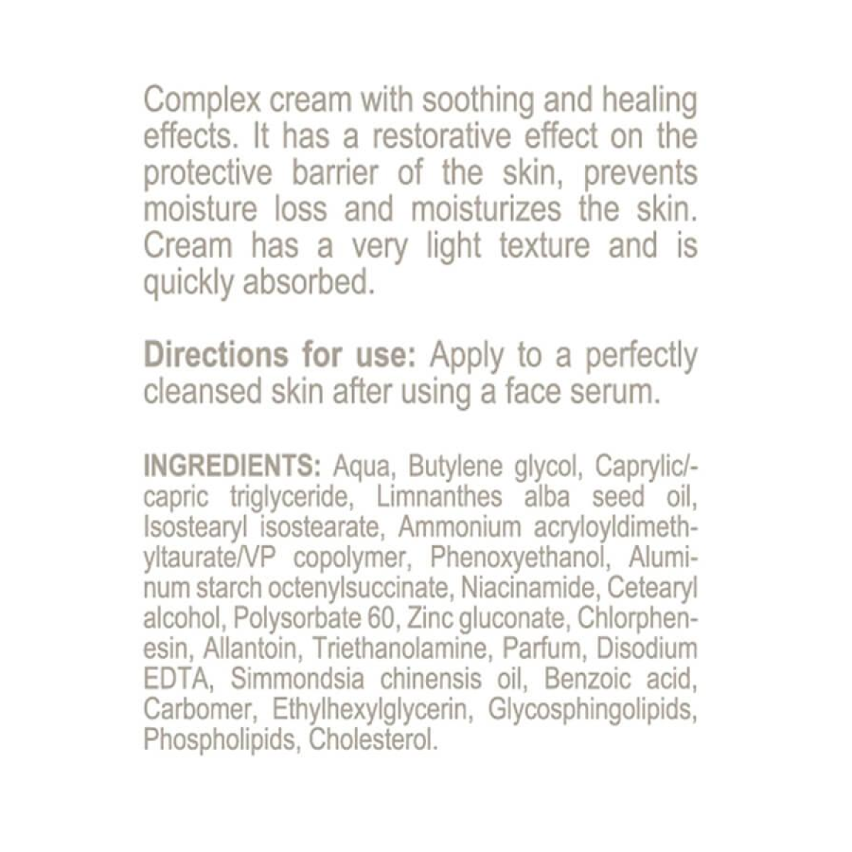 Легкий крем для відновлення балансу шкіри ідеально відновлює ліпідну мантію шкіри, нормалізує якісний і кількісний склад жирних кислот на поверхні епідермісу. Крем діє заспокійливо на шкіру, зменшуючи прояви запальних реакцій.