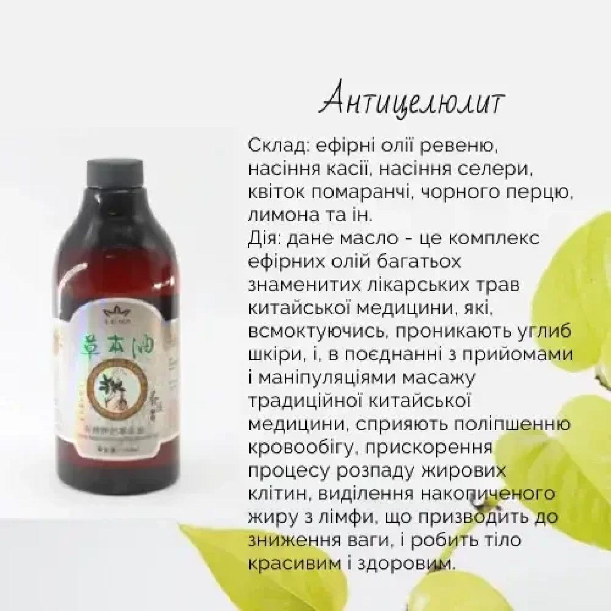Дія: ця олива — це комплекс ефірних олій багатьох знаменитих лікарських трав китайської медицини, які, всмоктуючись, проникають углиб шкіри, і, у поєднанні з прийомами та маніпуляціями масажу традиційної китайської медицини, сприяють поліпшенню кровообігу, прискоренню процесу розпаду жирових клітин, виділенню накопиченого жиру з лімфи, що призводить до зниження ваги, і робить тіло гарним і здоровим.