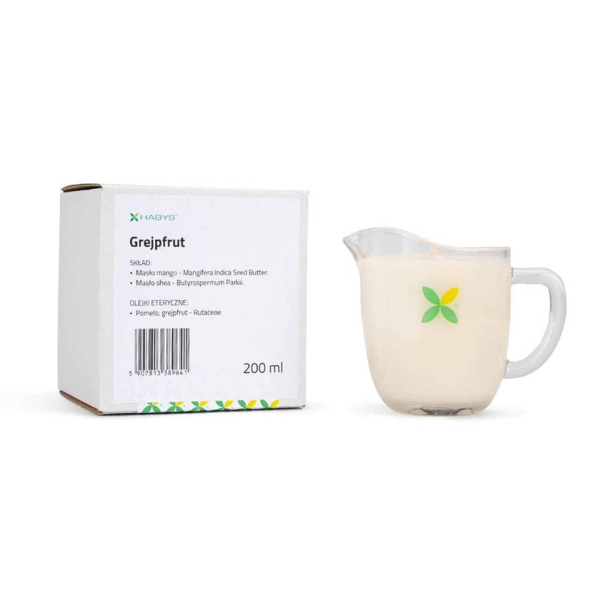 Масажна свічка Habys в естетичному скляному глечику. Енергійний фрукт грейпфрута та помело, а також поживні інгредієнти роблять масаж свічками справжнім ритуалом для тіла та почуттів.