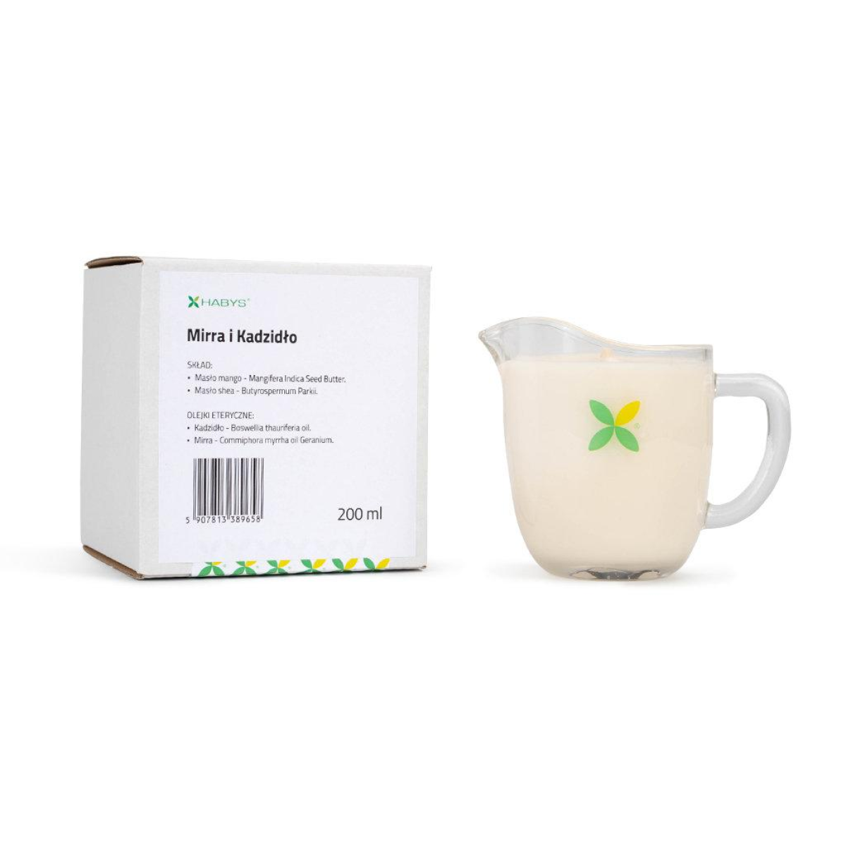 Масажна свічка Habys в естетичному скляному глечику. Заспокійливий аромат мирри та ладану та поживні компоненти роблять масаж свічками справжнім ритуалом для тіла та почуттів.