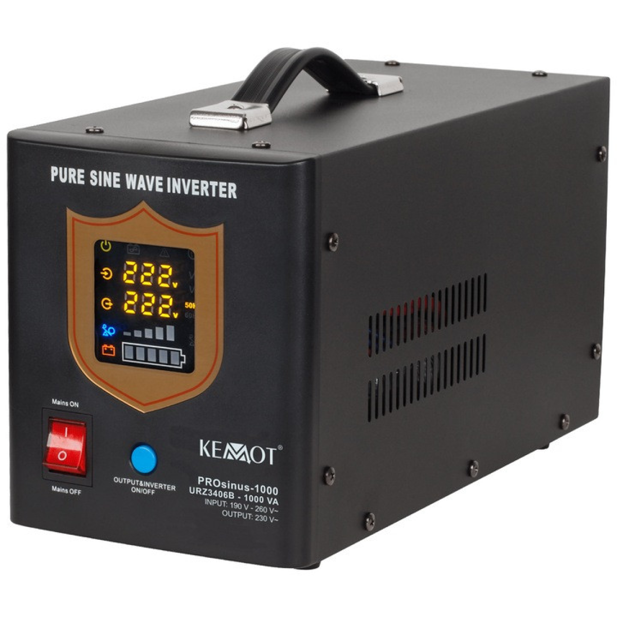 Аварійні джерела живлення KEMOT PROSinus оснащені чітким світлодіодним дисплеєм, який відображає поточний робочий стан пристрою. На дисплеї ви можете перевірити, серед іншого: вхідна напруга, вихідна напруга та частота. Крім того, ви можете швидко перевірити рівень навантаження та рівень заряду батареї
