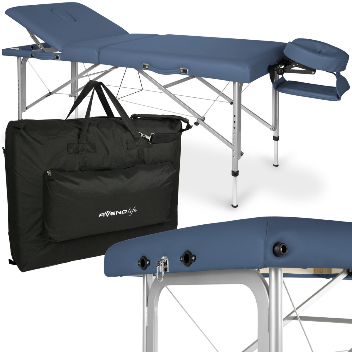 Алюмінєвий масажний стіл Vesta - це найвища модель алюмінієвих столів Aveno Life з підйомною стільницею. U-подібна форма алюмінієвих профілів забезпечує високу стійкість і полегшує доступ до пацієнта. Стіл продуманий до дрібниць. Має швидке і просте регулювання висоти завдяки спеціальному поперечному перерізу ніжок.