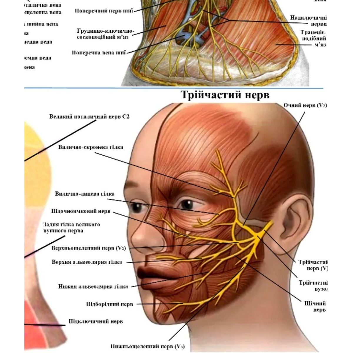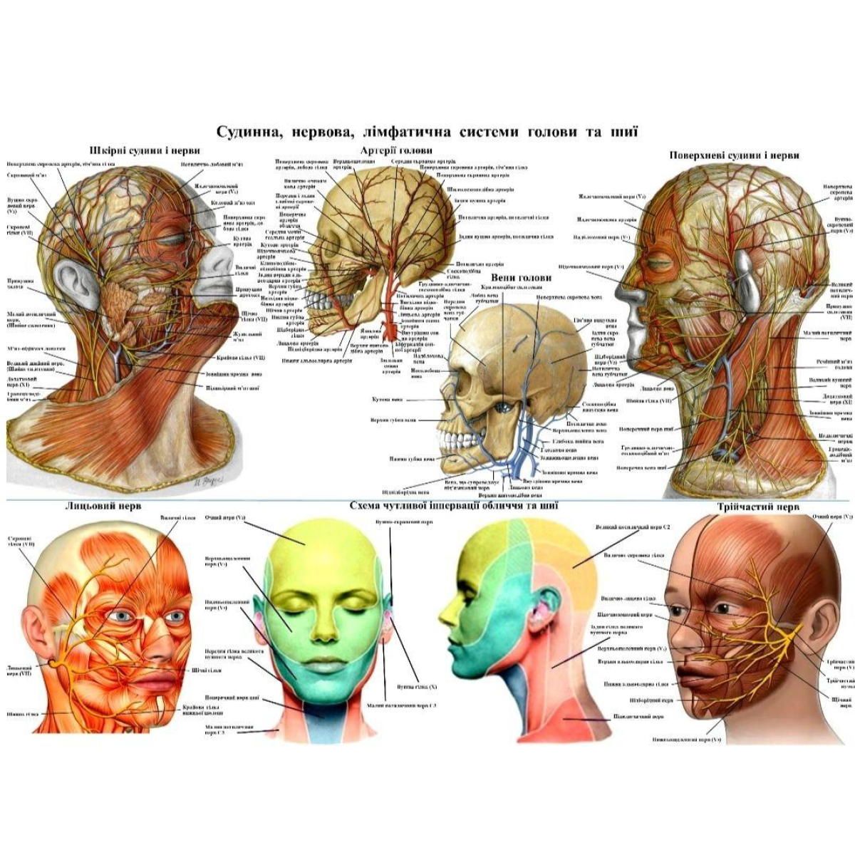 Анатомічний плакат Судини лімфовузли та нерви обличчя 52х67 см Плакат з анатомії Освітній плакат з анатомії