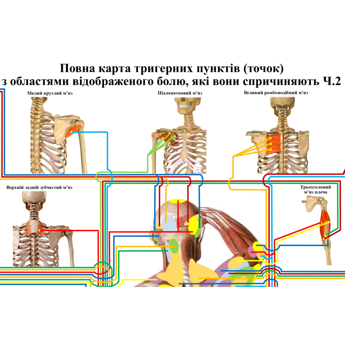 Схема створена за матеріалами The Trigger Point Therapy Workbook, 3rd Edition by Amber Davies, Maria Worley, Copyright © 2013 by Amber Davies, Maria Worley, and New Harbinger Publications. Дає змогу за розташуванням ділянки відбитого болю (затерпання, оніміння) швидко знайти м'яз та його тригерні пункти, які створюють цю проблему. З огляду на те, що на одній ділянці тіла можуть розміщуватися ділянки відбитого болю від кількох різних м'язів, схема допомагає одразу продіагностувати всі м'язи, що «провокують».