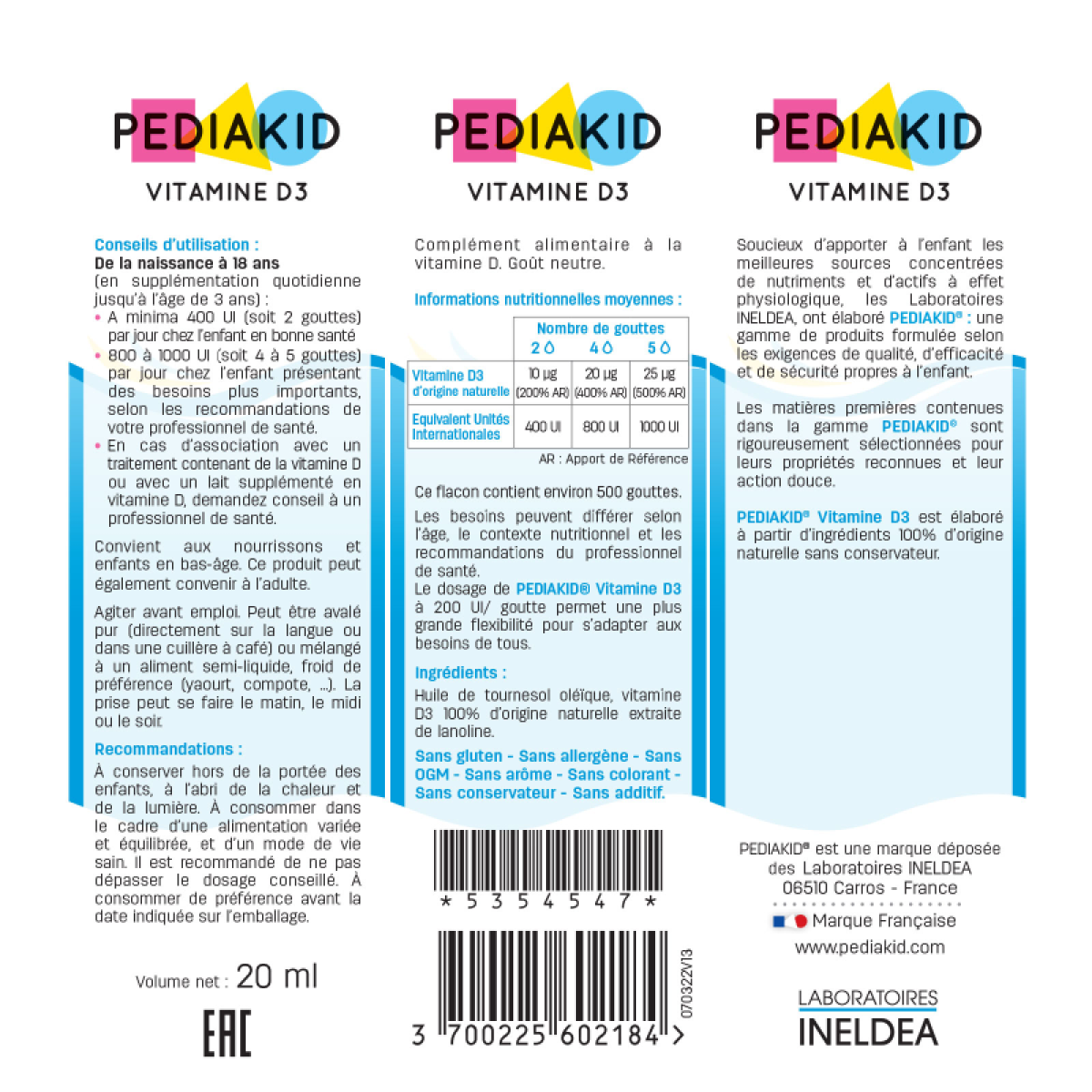 Вітамін Д3 Pediakid Vitamine D3 від 0 міс. 20 мл Дитячі краплі вітамін д Рідкий вітамін д3 для дітей