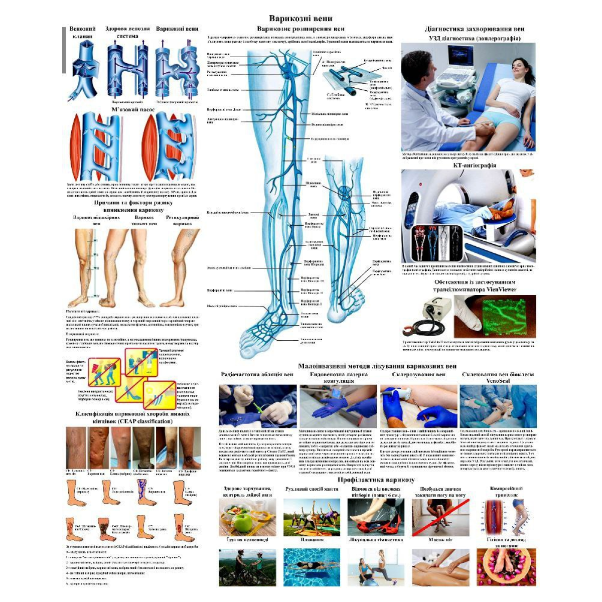 Даний широкоформатний плакат «Варикозні вени» розроблений як деталізований навчальний та демонстраційний матеріал для фахівців-флебологів, судинних хірургів та медичних закладів.