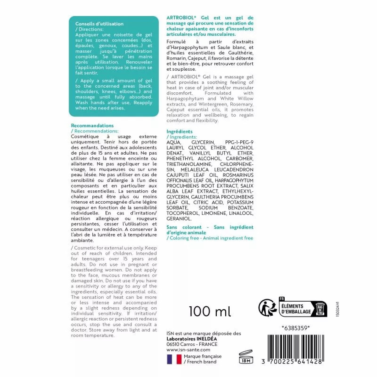 Artrobiol Гель — це професійний масажний засіб від французької лабораторії INELDEA, спеціально розроблений для швидкого зняття дискомфорту в опорно-руховому апараті. Завдяки поєднанню фітоекстрактів та цілющих ефірних олій, гель створює приємний зігрівальний ефект, який розслаблює затиснуті м'язи та покращує рухливість суглобів.