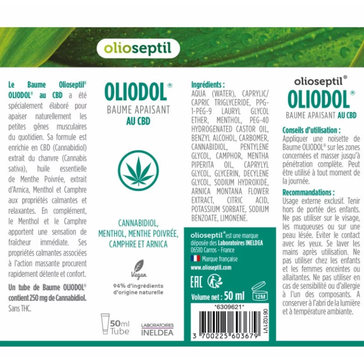 Olioseptil Olidol CBD Balm — це високоефективний засіб зовнішнього застосування від французької лабораторії INELDEA. Завдяки унікальній формулі, що містить 250 мг чистого каннабідіолу (CBD) у поєднанні з камфорою, ментолом та арнікою, бальзам забезпечує миттєве полегшення при болях у м'язах, спині, шиї або ногах.